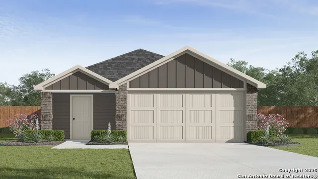 The Caprock is a charming one-story home featured at Sereno Springs in Converse, TX. Featuring 2 classic front exteriors, this 3 bedroom, 2 bathroom home also offers 1435 square feet of living space and a 2-car garage. A front porch (per plan) welcomes you into the home and opens to the gourmet kitchen which includes quartz counter tops, quality cabinets, stainless steel appliances and an open concept floorplan with the kitchen flowing seamlessly into the dining room and living room. The main bedroom has an attractive ensuite bathroom that features a quartz vanity countertop and quality cabinetry. Enjoy additional storage with a spacious walk-in closet located off of the primary bathroom. Your secondary bedrooms all feature quality carpet flooring and a closet, and can be used as bedrooms, offices, work out spaces or other bonus rooms. The possibilities are endless with The Caprock floor plan. Additional features include sheet vinyl flooring in entry, living room, and all wet areas, quartz counter tops in all bathrooms and HOME IS CONNECTED base package. Using one central hub that talks to all the devices in your home, you can control the lights, thermostat and locks, all from your cellular device.